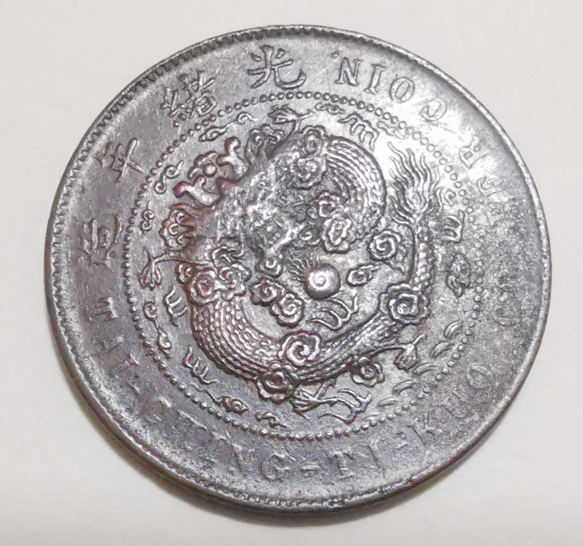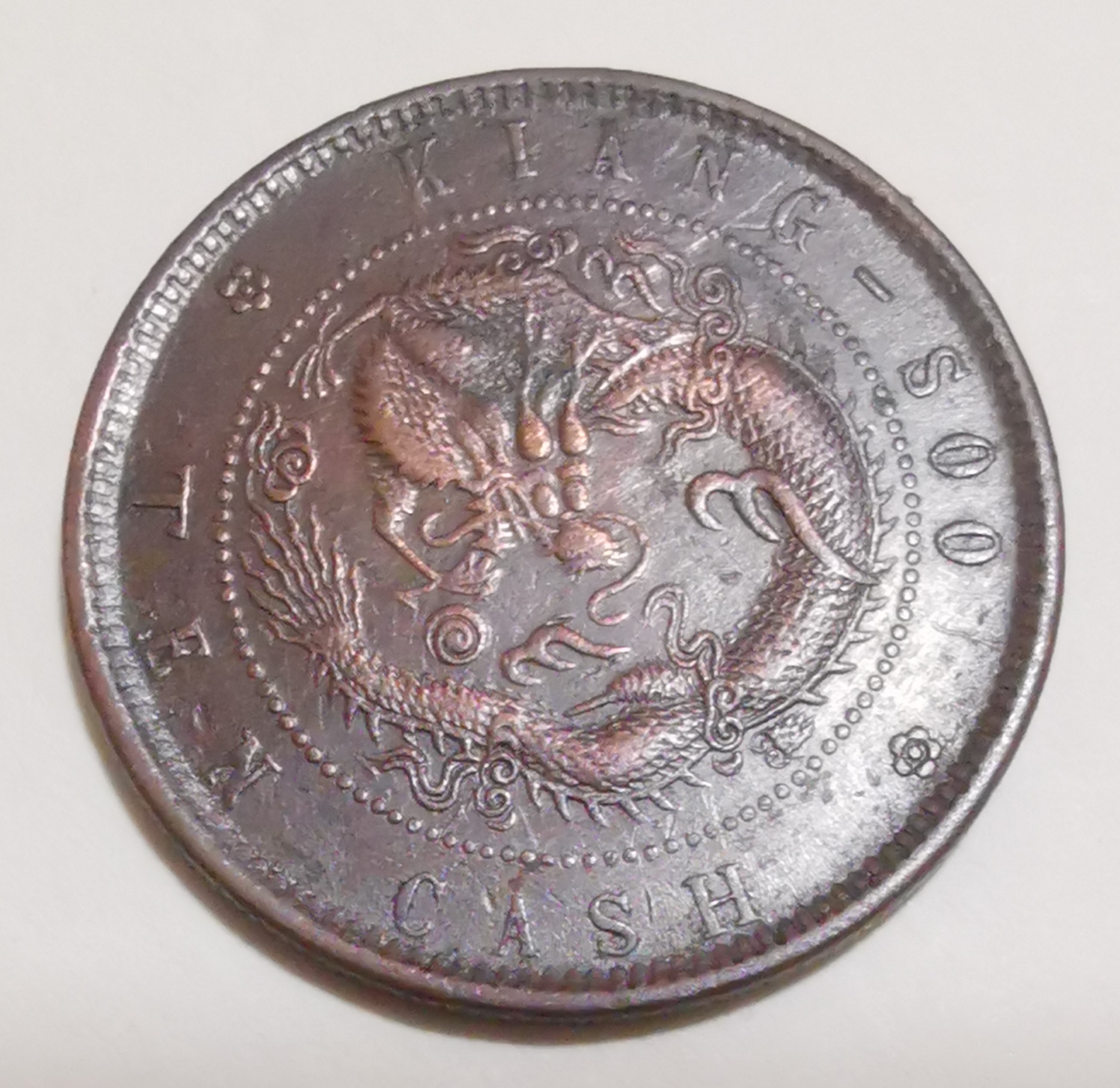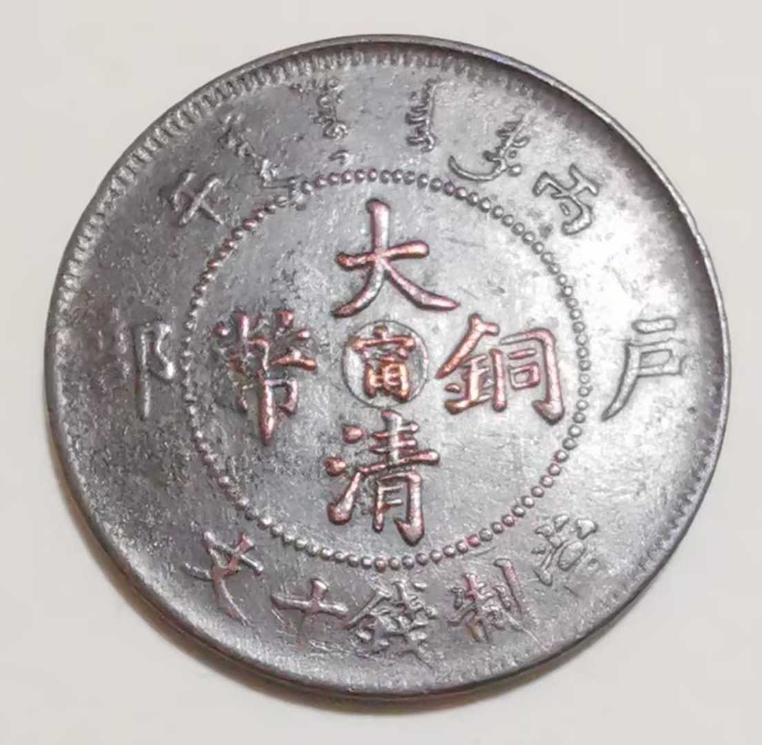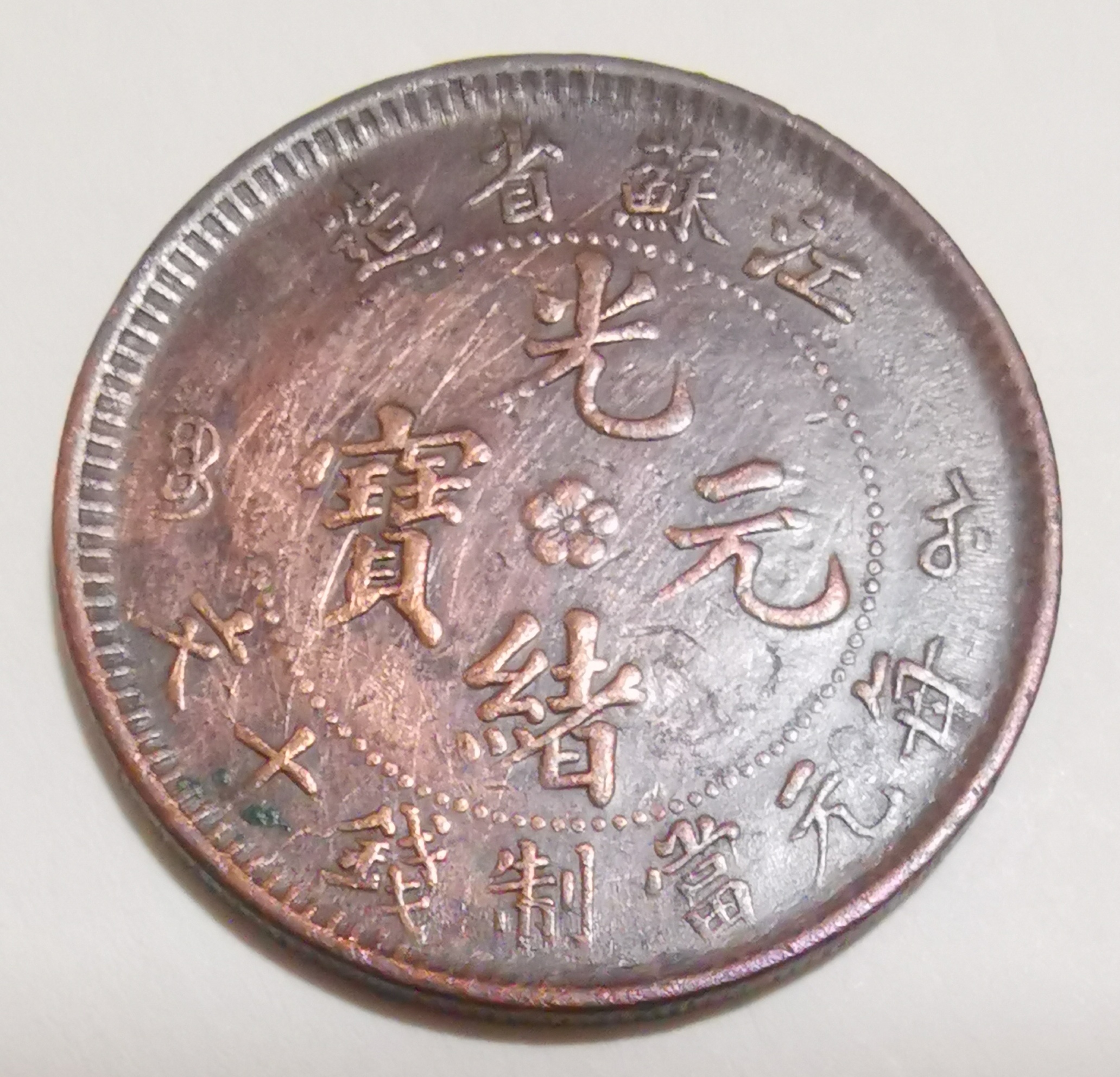 江苏省造光绪元宝,当钱十文,该币直径为28mm,厚度2mm, 重量8克,材质红铜。该古钱币在制造时,因机制工人在放置模具加工时把正反面模具角度装错,人为制造了背逆55°角度的错版币;古钱币龙尾巴为九条,古人常称"九五之尊","九"是皇权最高数,故清政府定九尾龙为正品,而这枚古钱币龙尾九条,体现了封建社会皇权至高无上。