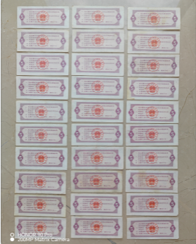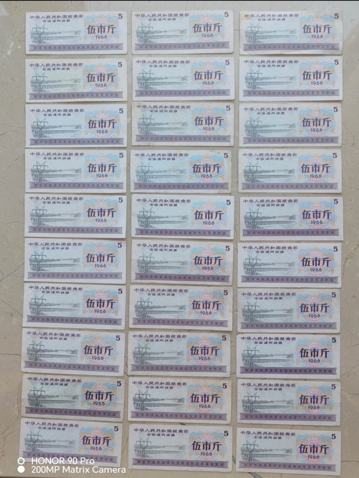 这是一组 1966 年版全国通用粮票伍市斤券,票面以浅粉为底,主图是水利枢纽与输电线路的建设场景,色彩柔和且充满时代特色。这批粮票品相完好,图案与文字清晰,是计划经济时期全国统一购粮的实物凭证,承载着一代人的生活记忆,兼具历史纪念意义与收藏价值