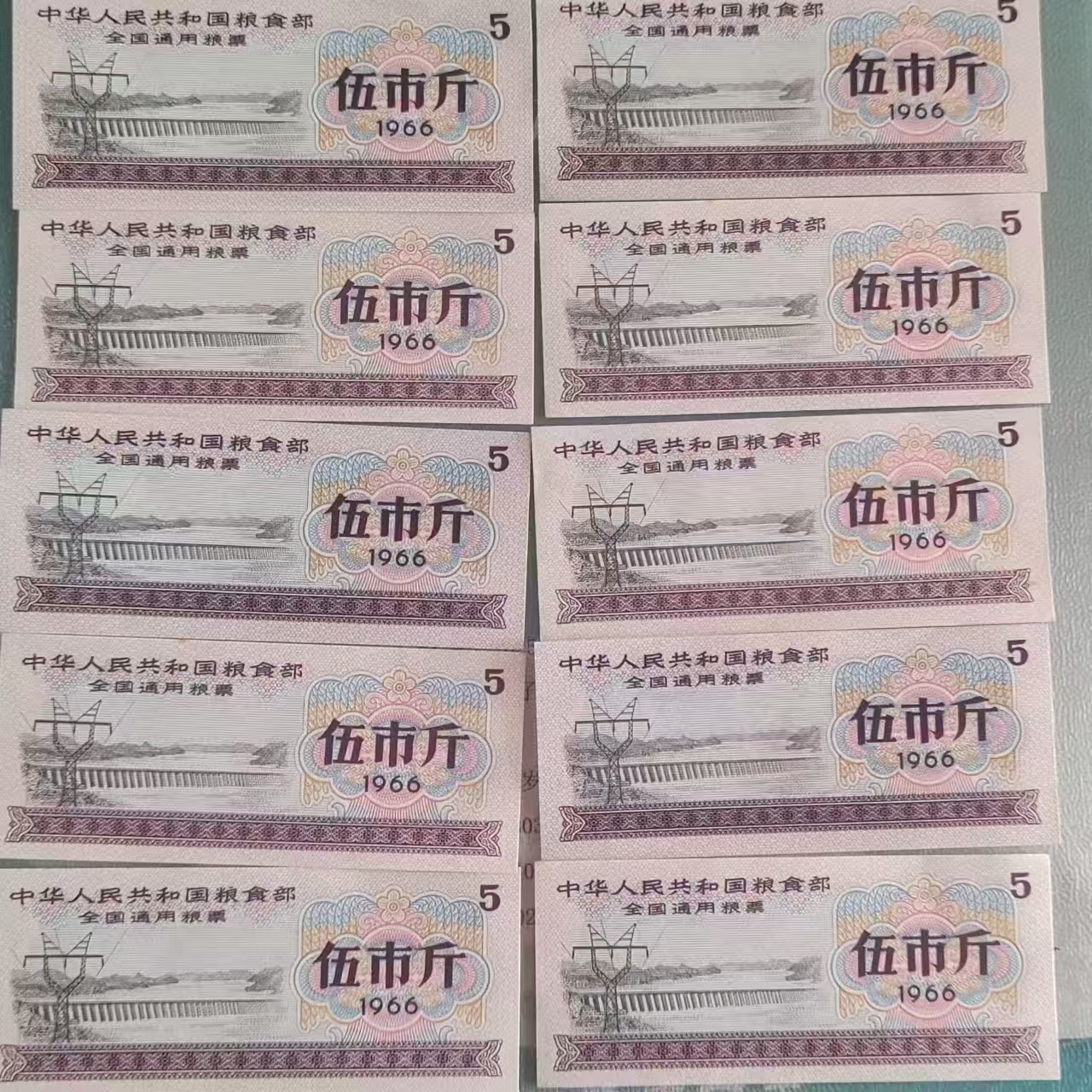 这是一组 1966 年版的全国通用伍市斤粮票,票面以浅粉为底,印着水库与输电线路的图案,兼具时代特色与实用印记。