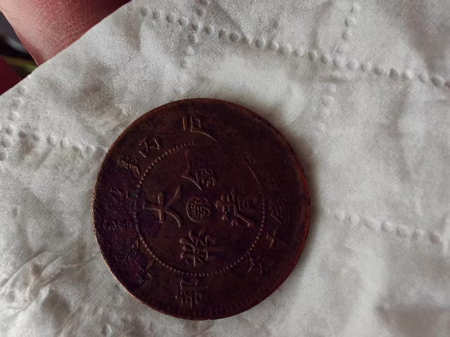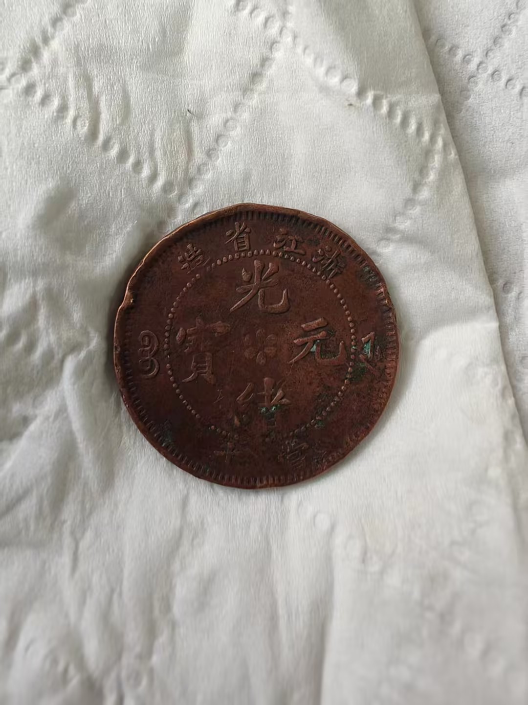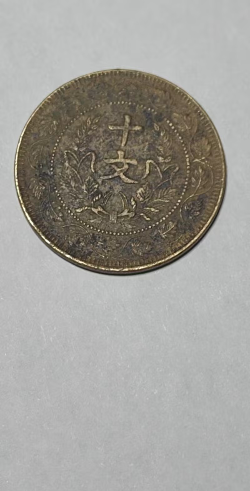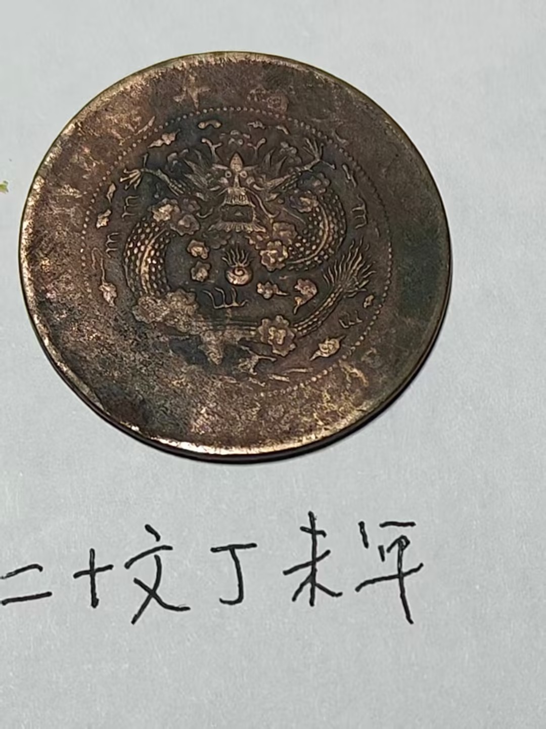 下方标注的 “二十文 丁未年” 字样,明确了它的面值与铸造年份,是晚清货币体系的实物见证,也承载着清末民初的流通记忆