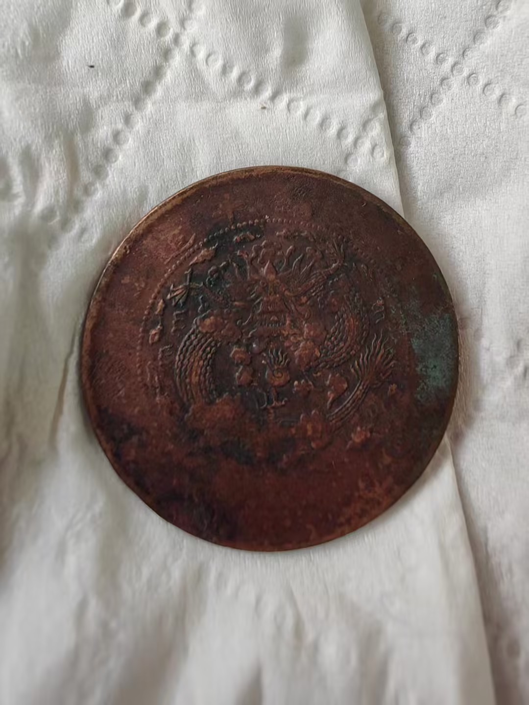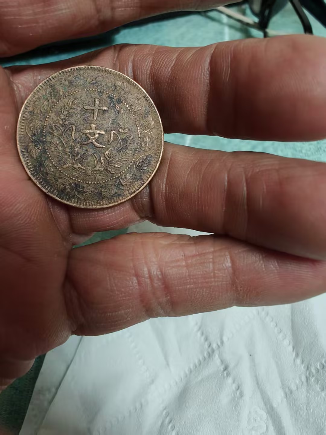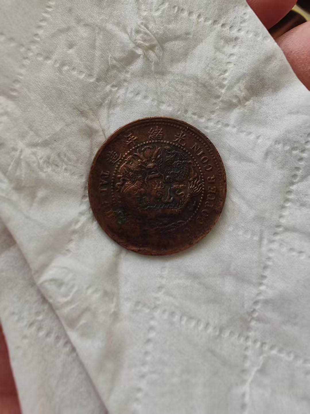 下方标注的 “二十文 丁未年” 字样,明确了它的面值与铸造年份,是晚清货币体系的实物见证,也承载着清末民初的流通记忆