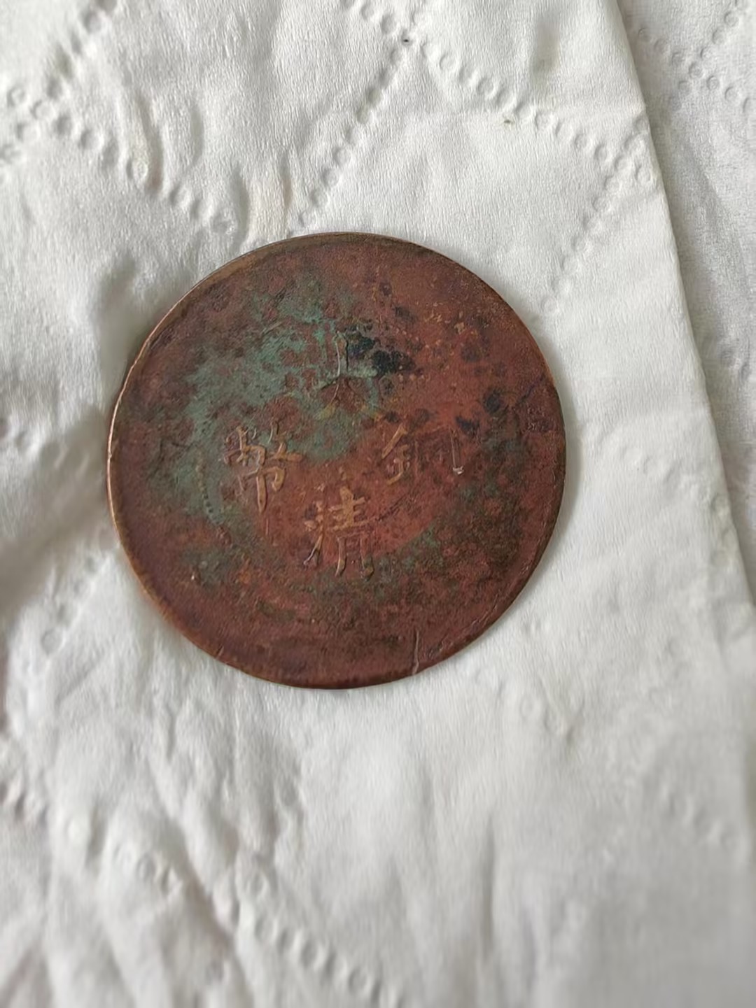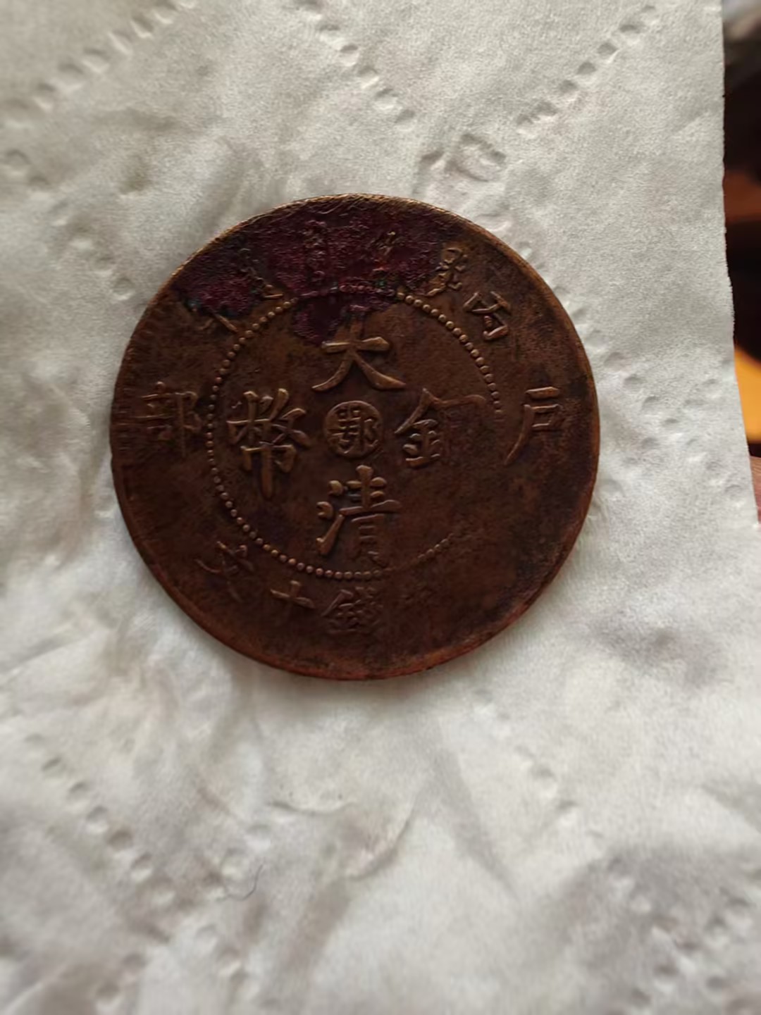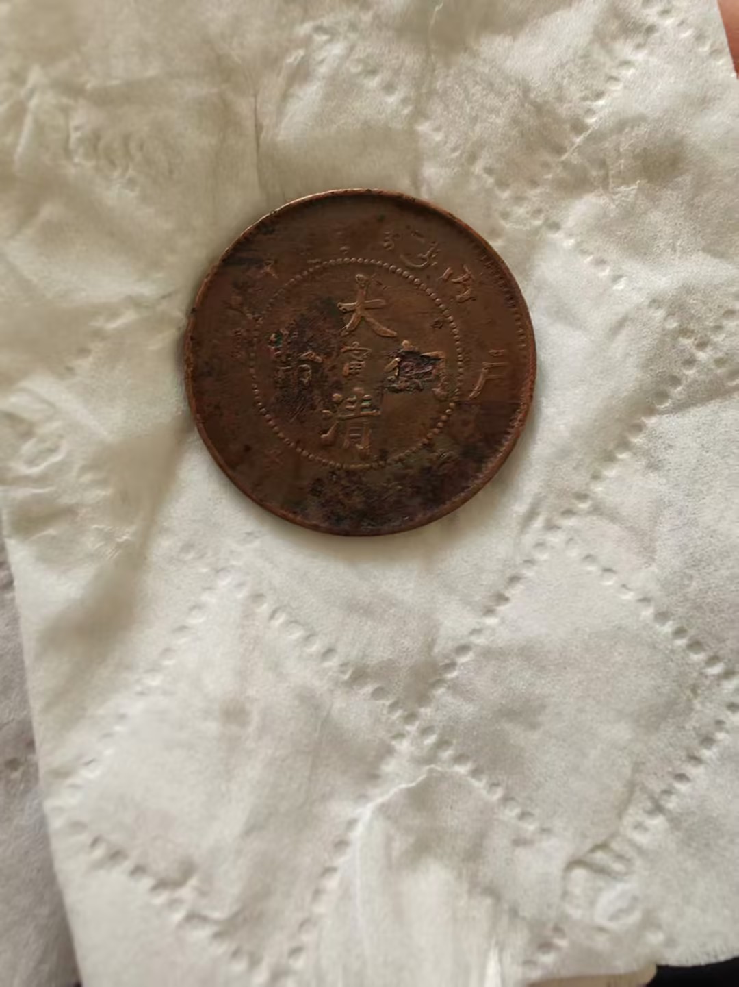 这是一枚清代丁未年造的二十文大清铜币,币面呈深褐色包浆,“大清铜币” 四字为阴刻,虽历经磨损,仍透着古朴厚重的质感。