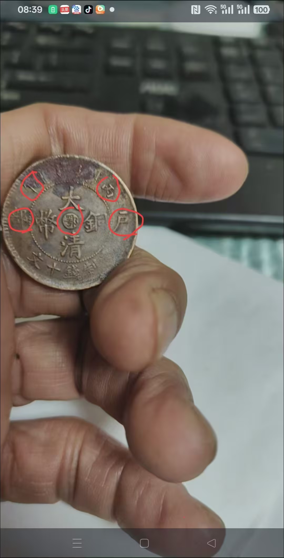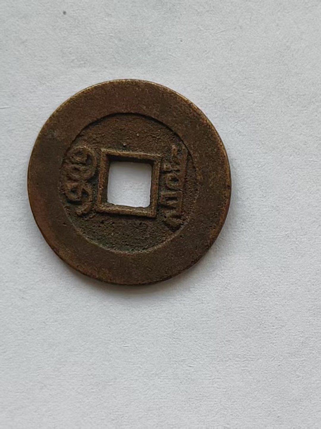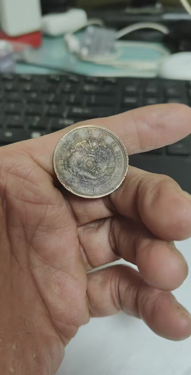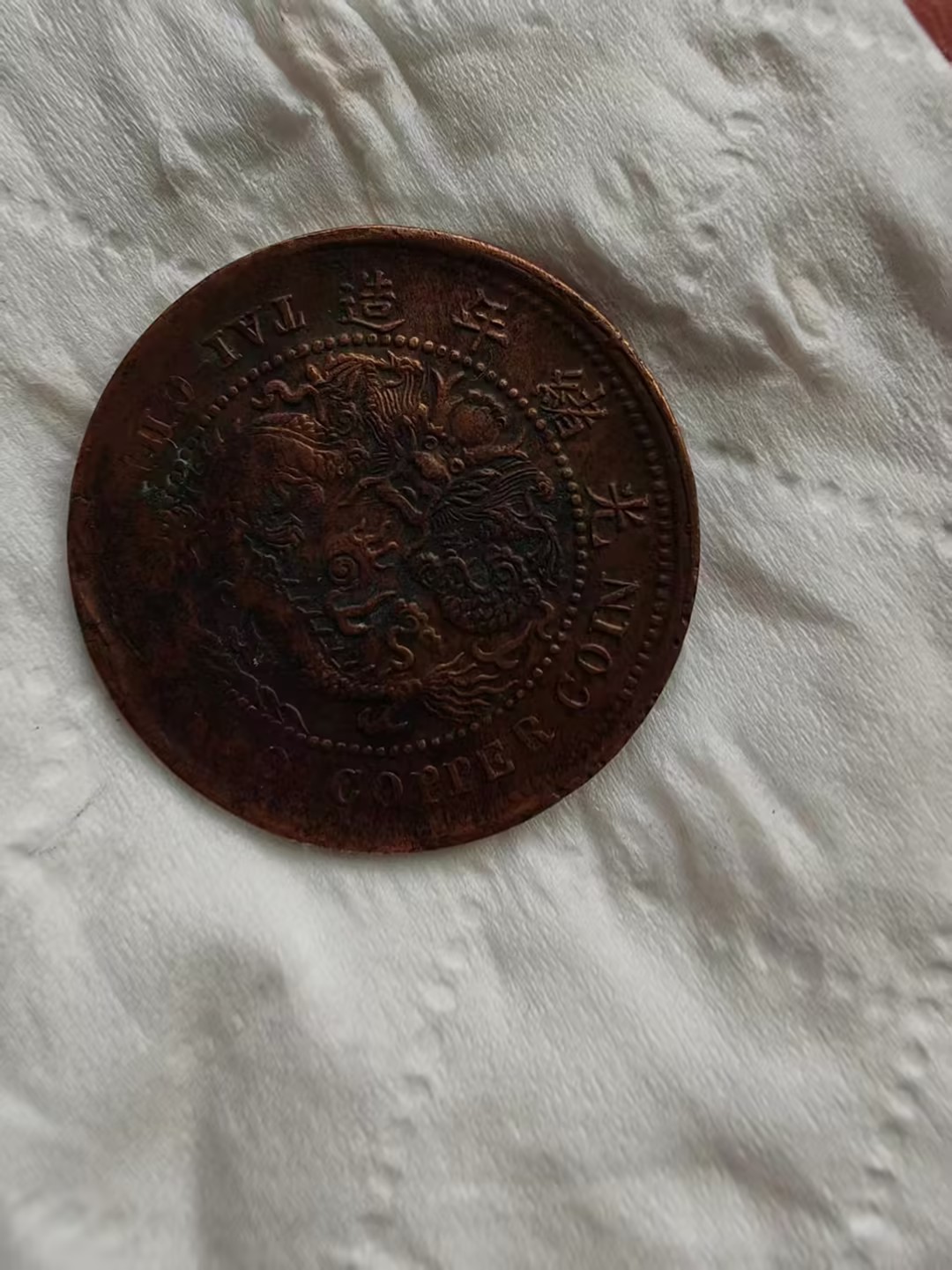 这是一枚清代丁未年造的二十文大清铜币,币面呈深褐色包浆,“大清铜币” 四字为阴刻,虽历经磨损,仍透着古朴厚重的质感。