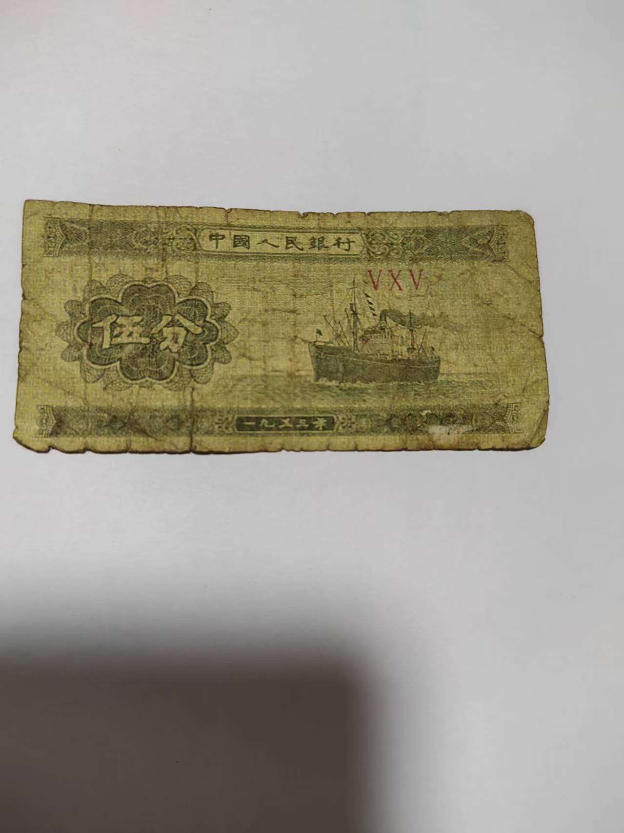 这是一张 1953 年版伍分纸币,票面以黄绿为底色,主图是一艘航行的轮船,设计简洁而充满时代感。