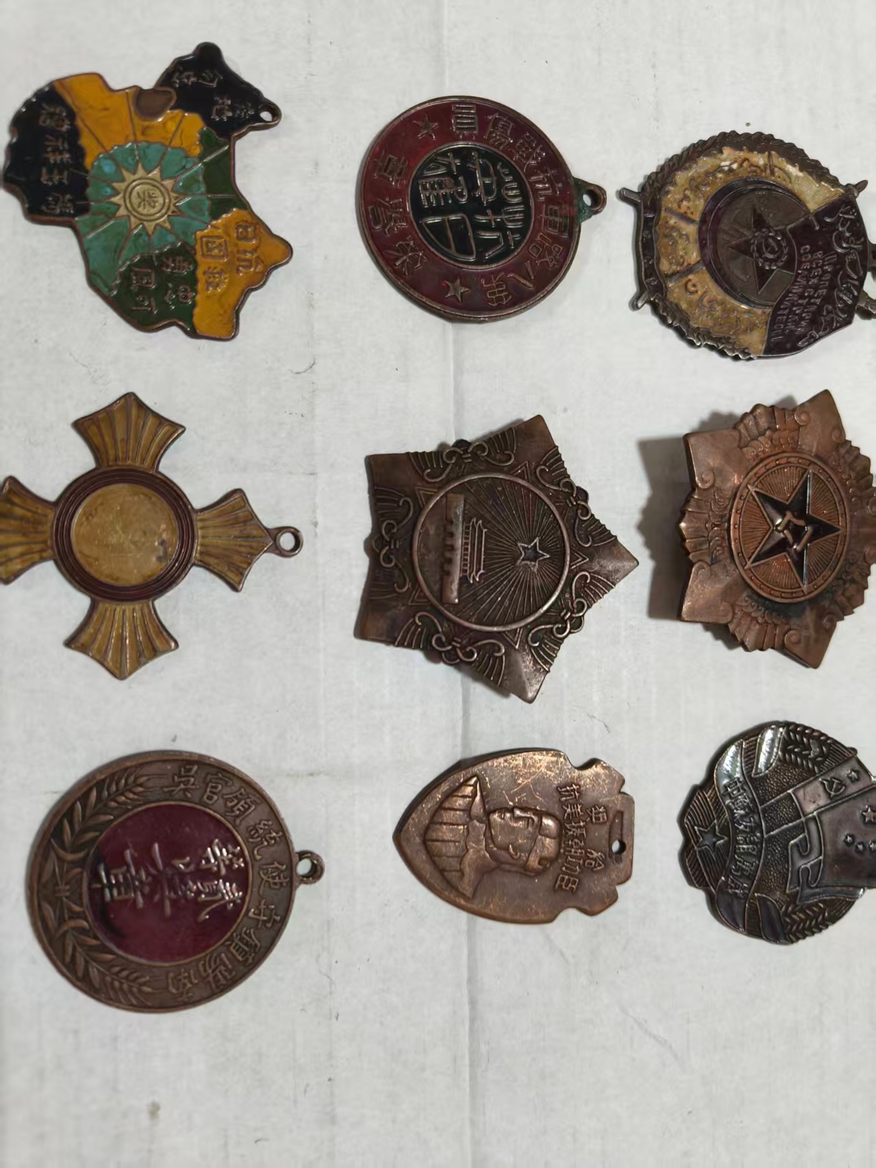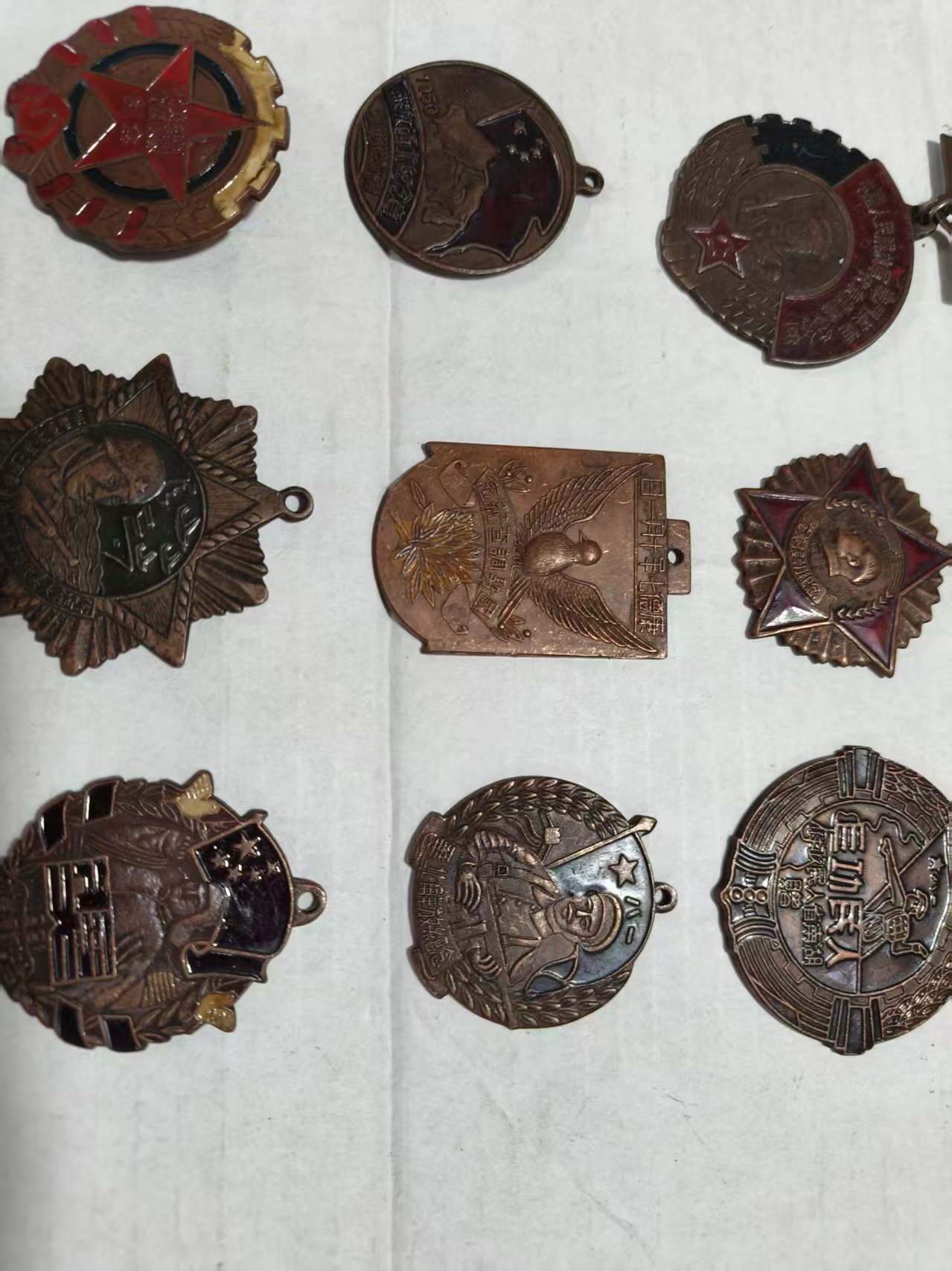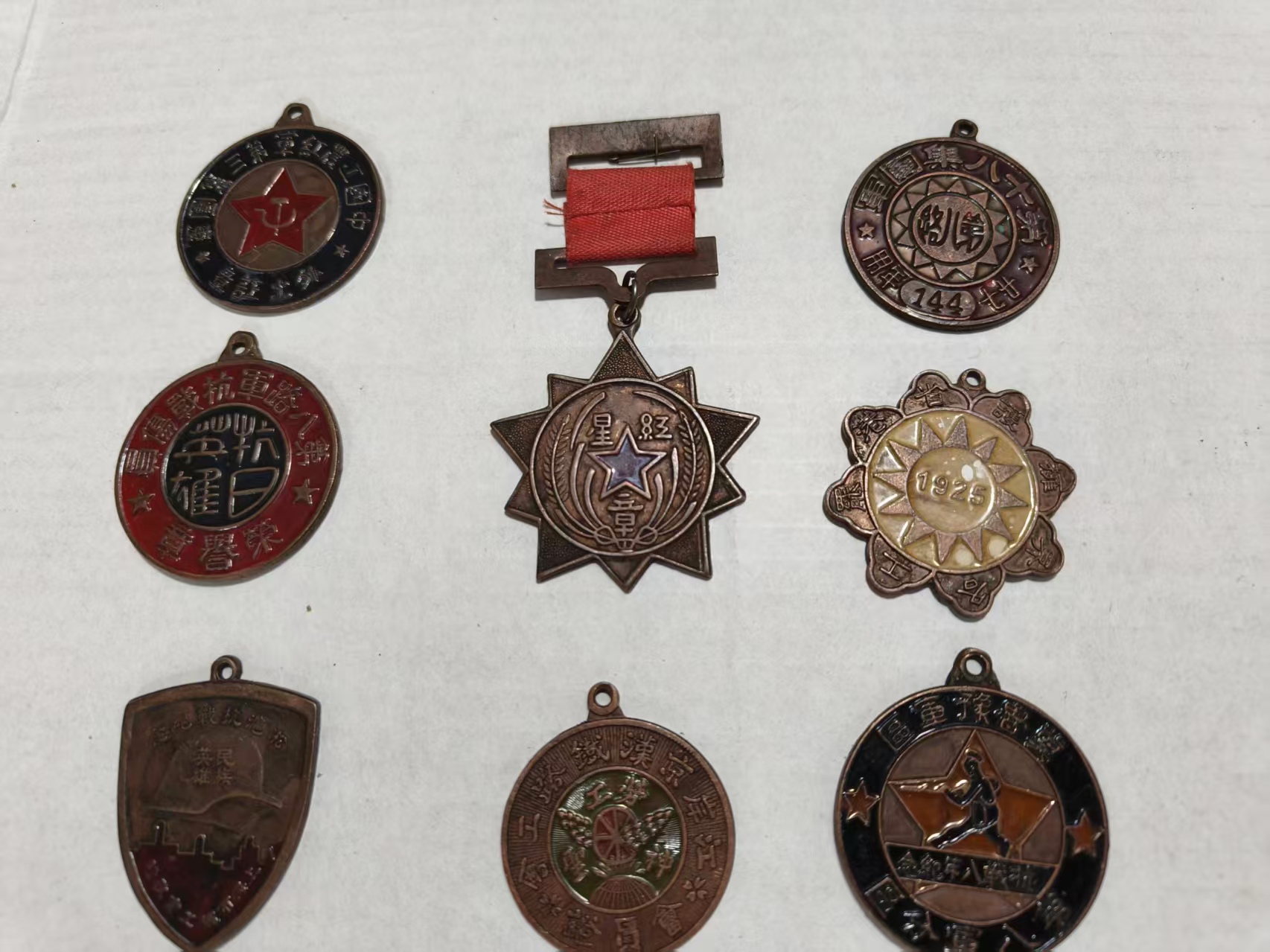 这是一组复刻的近现代纪念徽章,涵盖红军、抗战等主题,造型包含圆形、星形、盾形等。徽章表面的红、金、黑等色彩与浮雕文字虽有磨损,但 “红星”“抗日”“英雄” 等字样仍清晰可辨,它们既是历史的缩影,也承载着对先辈的敬意,兼具纪念与收藏价值