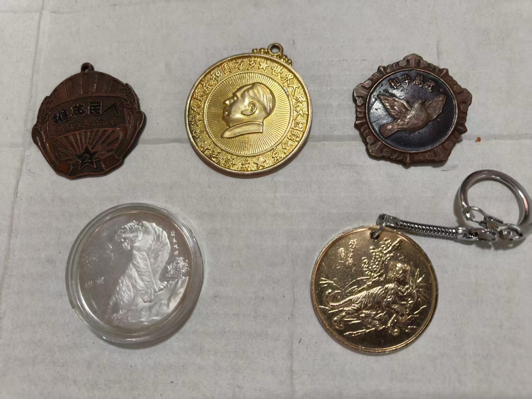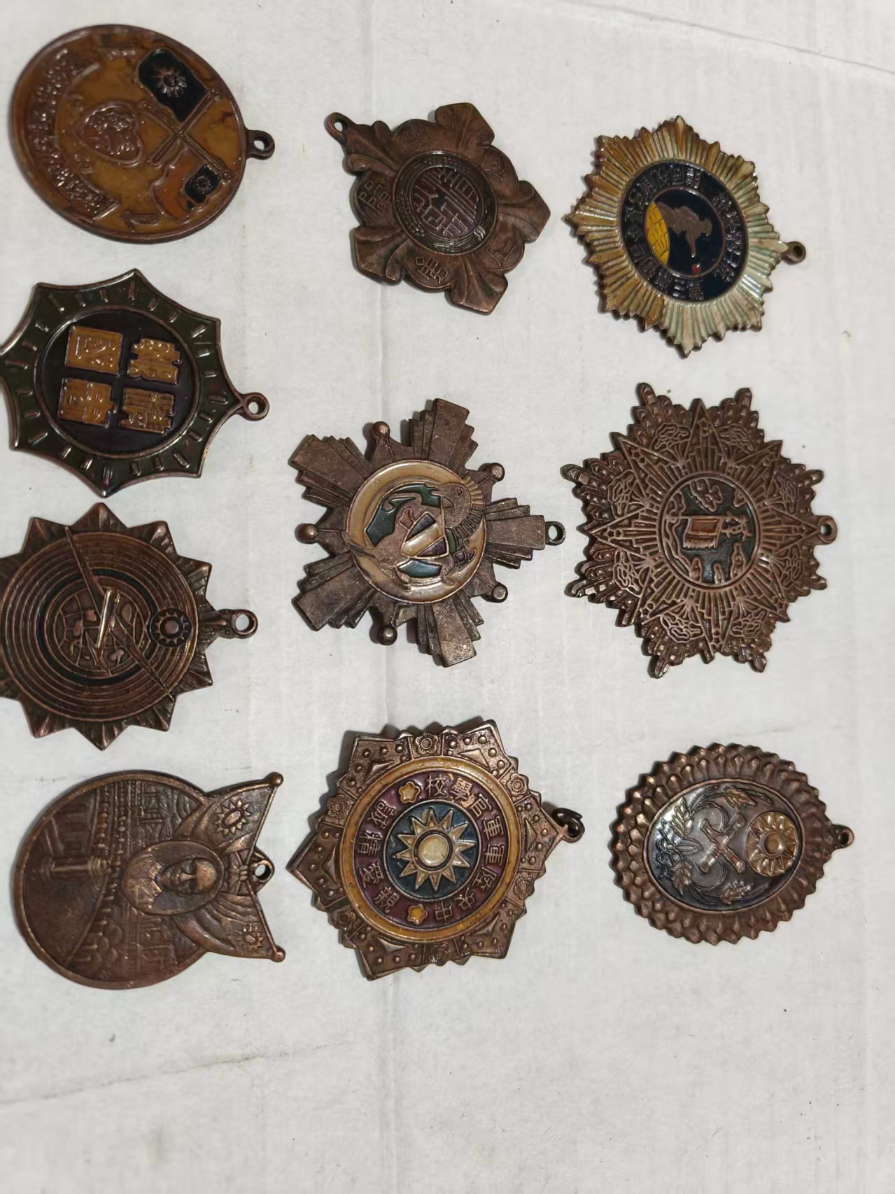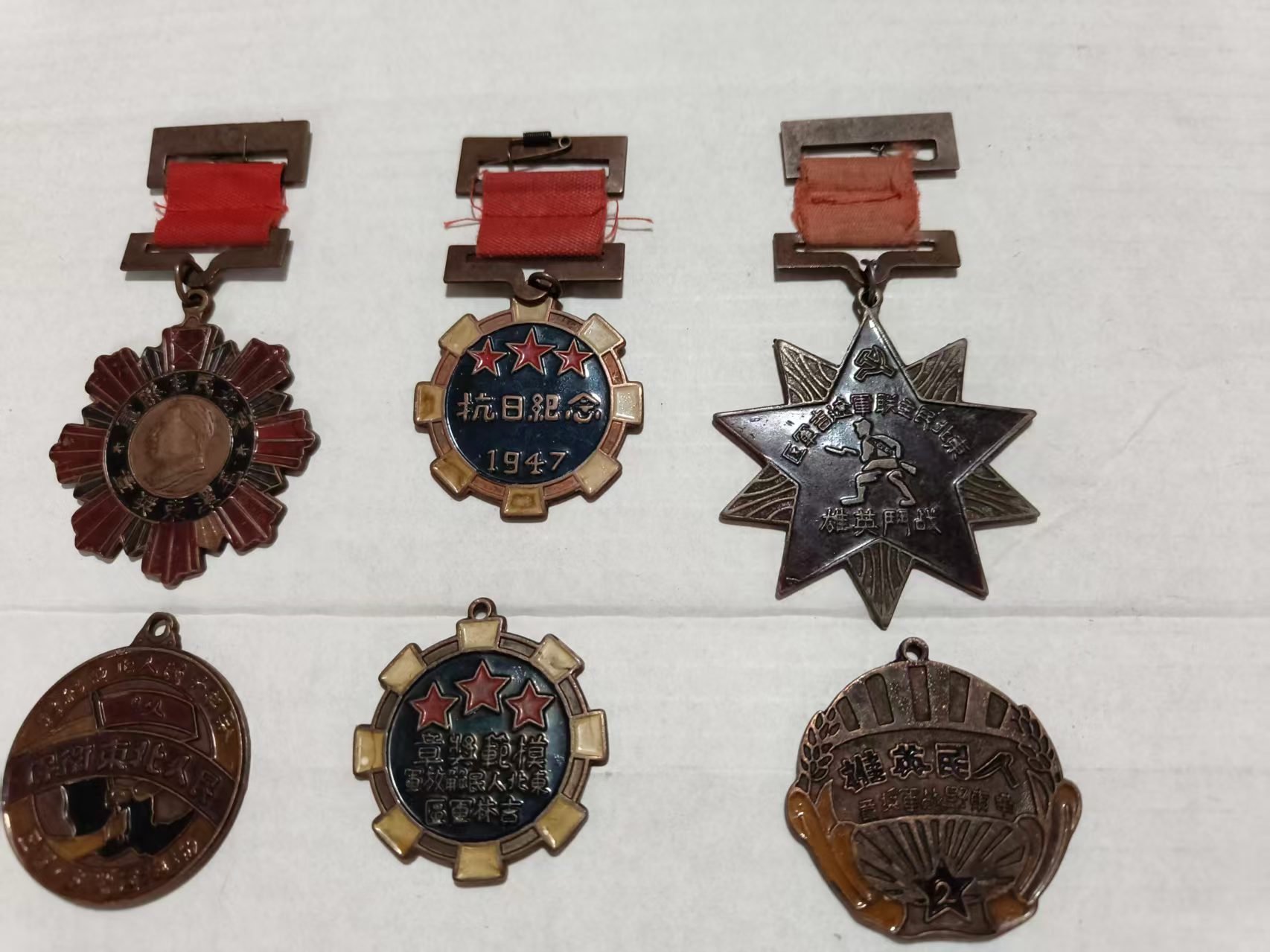 这是一组复刻的近现代纪念徽章,涵盖红军、抗战等主题,造型包含圆形、星形、盾形等。徽章表面的红、金、黑等色彩与浮雕文字虽有磨损,但 “红星”“抗日”“英雄” 等字样仍清晰可辨,它们既是历史的缩影,也承载着对先辈的敬意,兼具纪念与收藏价值