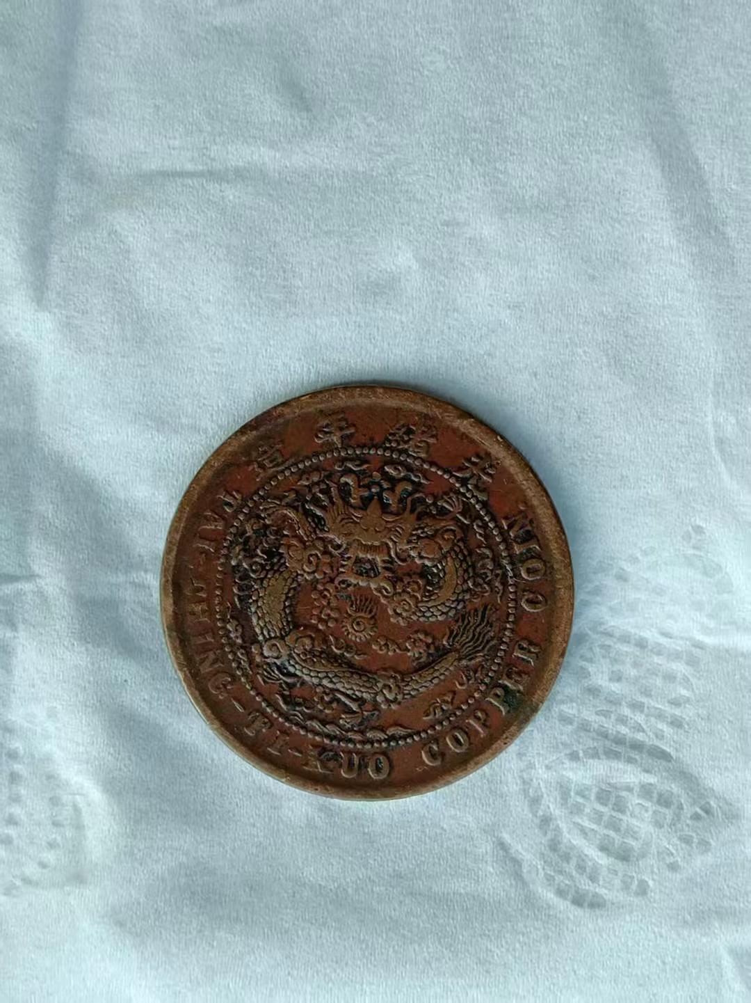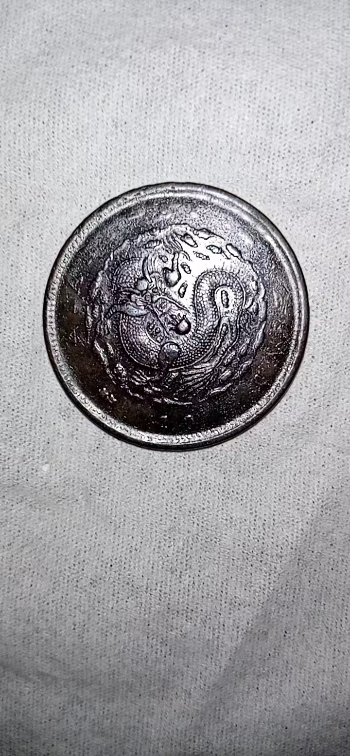 这是一件银质硬币,通体呈深银色,碟心浮雕着一条姿态矫健的游龙,龙身纹路细密,鳞片与须爪清晰可辨,尽显威严灵动。