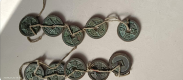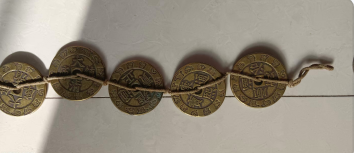 这是一串五帝钱,以麻绳串起五枚铜钱,币面刻有清代年号,边缘饰以花纹,包浆古旧自然。它不仅是民俗文化中寓意镇宅、招财的吉祥物件,也兼具复古装饰与文化象征意义,挂于家中或随身佩戴,既有传统韵味,又承载着人们对平安顺遂的祈愿。