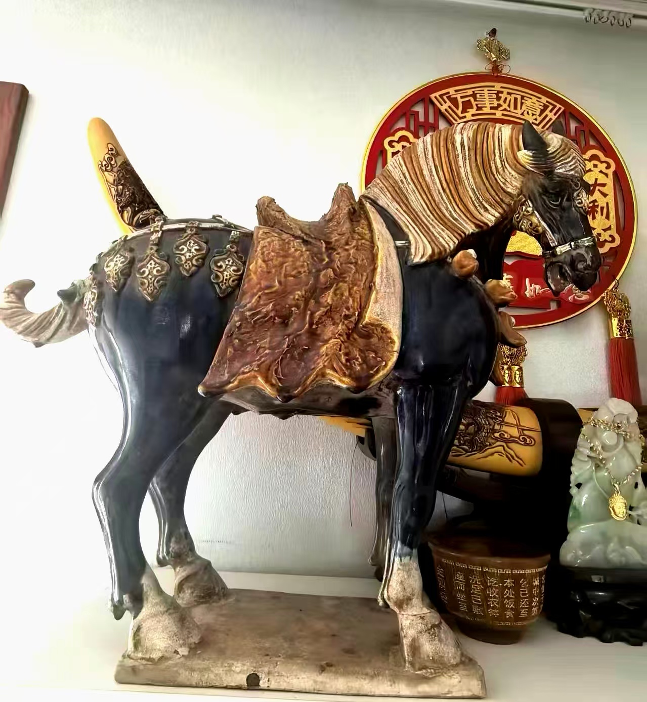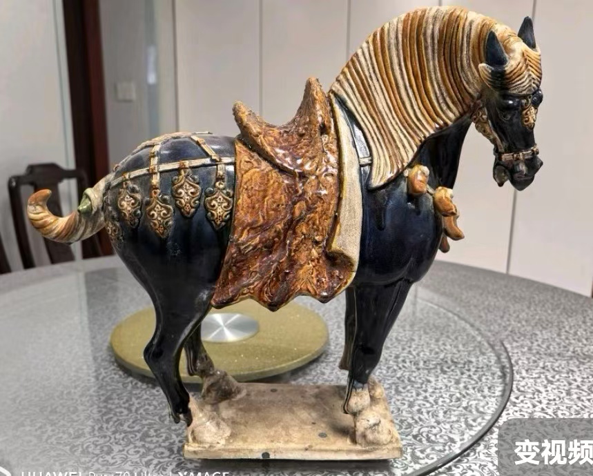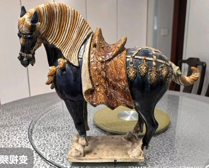 它黑釉如漆,金彩似霞,色彩交融间尽显华贵,寓意事业顺遂、前程似锦;昂首奋蹄的姿态,暗含马到成功、步步高升的祝福;鞍鞯上的精致纹饰,更承载着对生活富足、平安喜乐的期许。